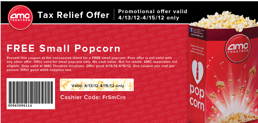 Print a coupon for a free small popcorn at AMC Theaters, valid through 4/15/12.
